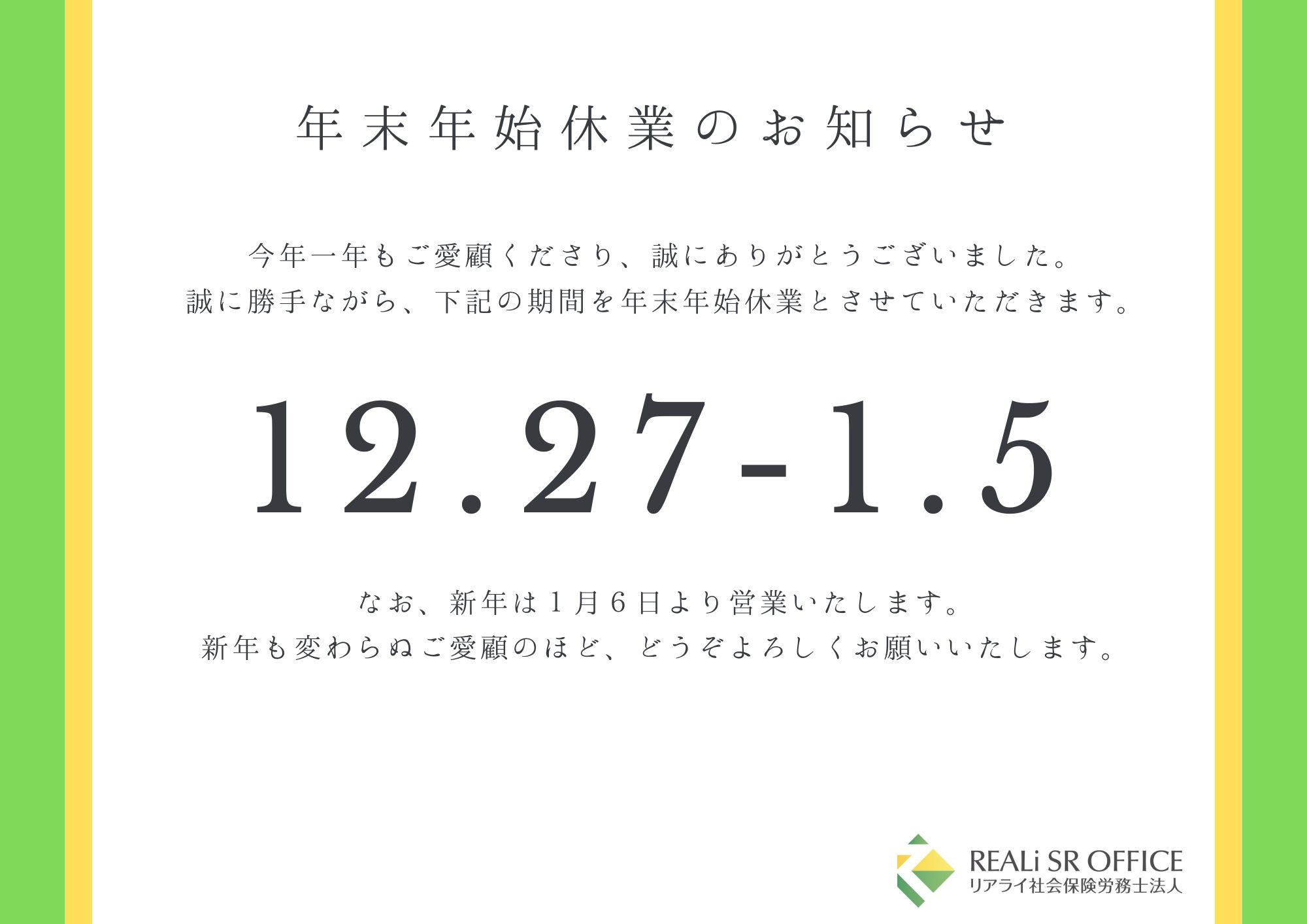 当事務所は、2022年12月27日(火)12時をもちまして、本年度の業務を終了いたします。